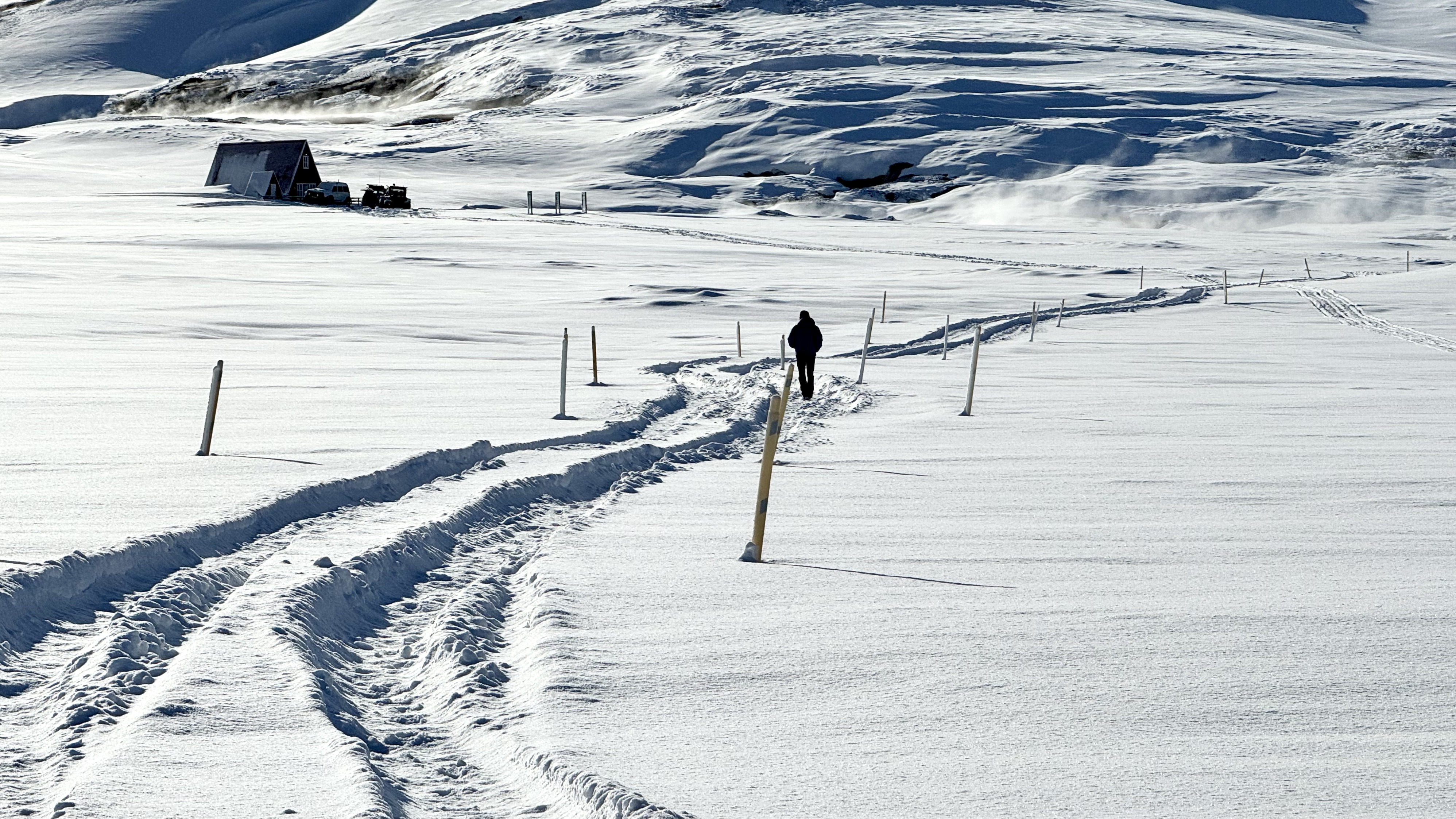 Maybe 200 meters up the route stood an A-frame building accompanied by three big-tire vehicles. The little building is a cabin for people who are off-roading through the countryside. Luckily, the three guys staying the night there were just about to collect their things and head out, so they could come pull our car out of the snow.