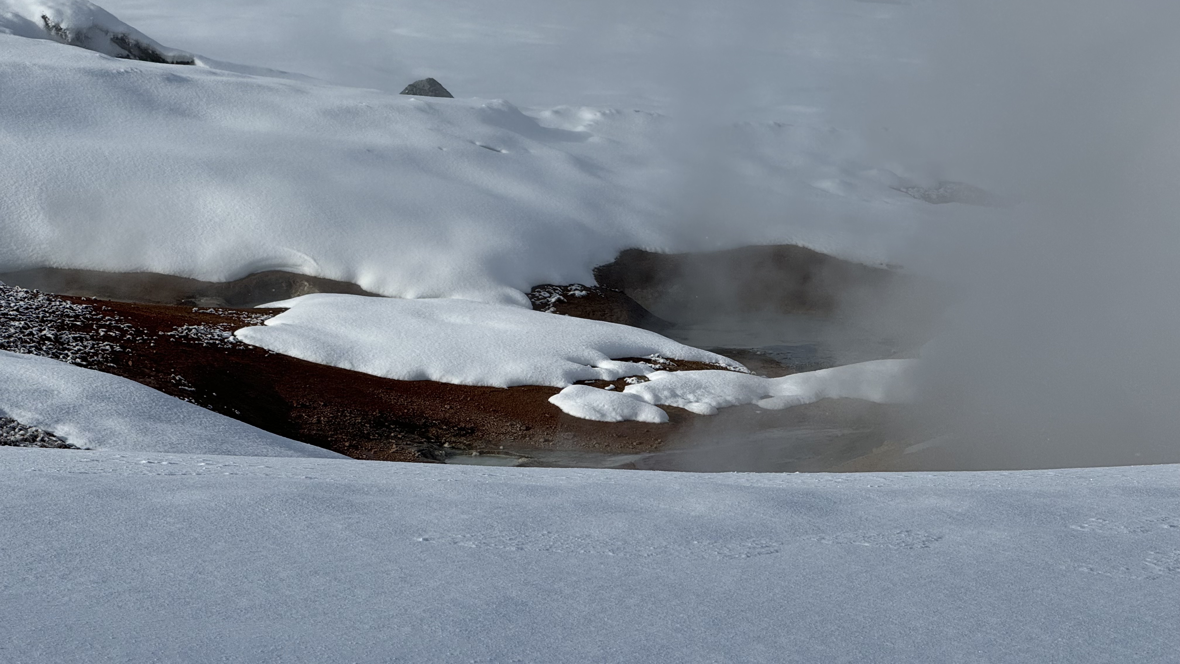 While all that was going on, Francesco encouraged us to walk up to the cabin, and then a bit beyond to take a look at the thermal vents. The sun was so bright and the air so cold (about -5 degrees C / 23 degrees F) that our transitions eye/sun glasses became so dark it was hard to see! Nonetheless, we clomped through the untouched snow for a bit, until it got deeper than the tops of our boots. But that was fine. The pleasure was simply being out there: snow all around, steam from quite a few natural vents, white hilly backdrop, and a vast view back across the valley.