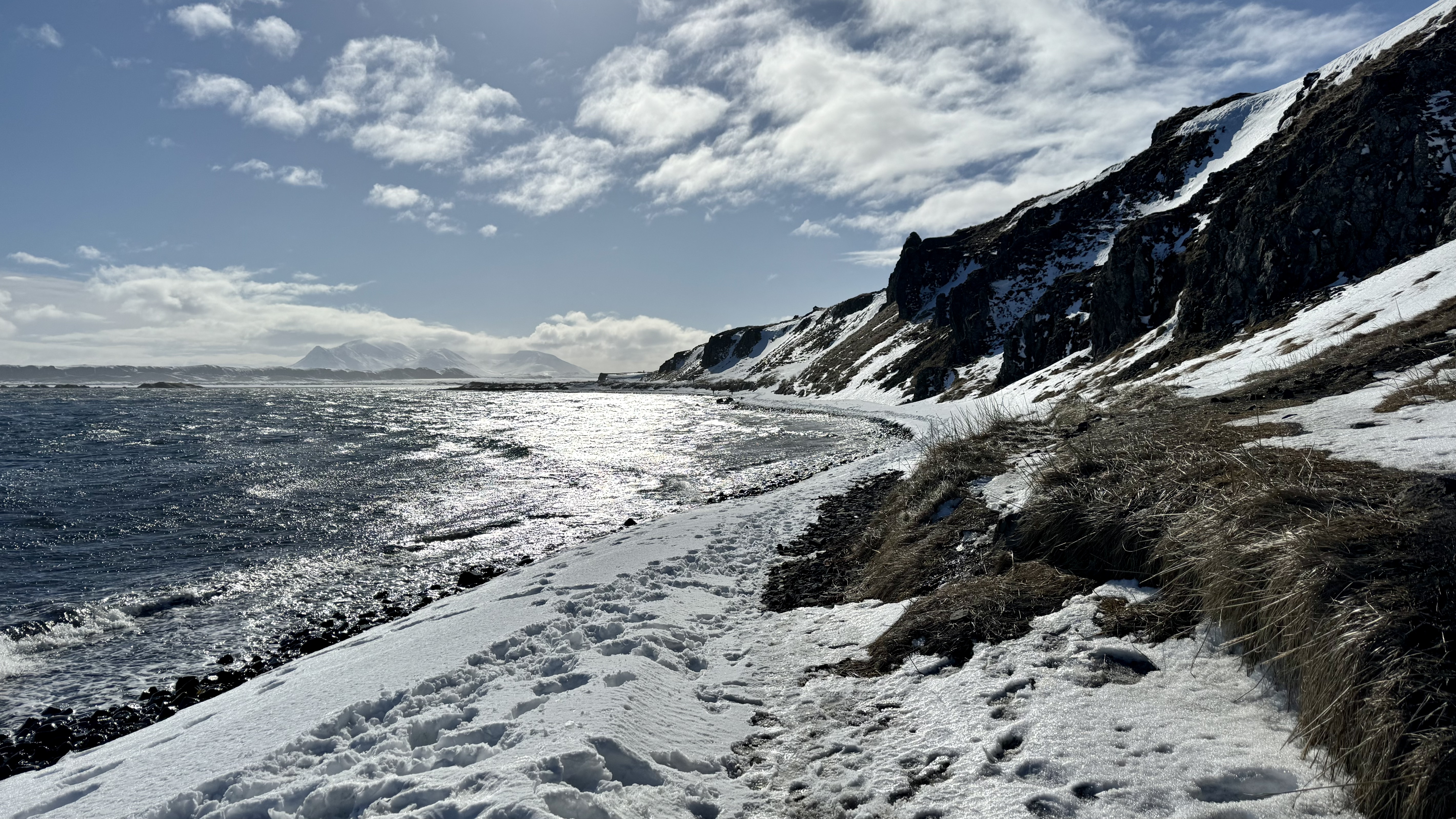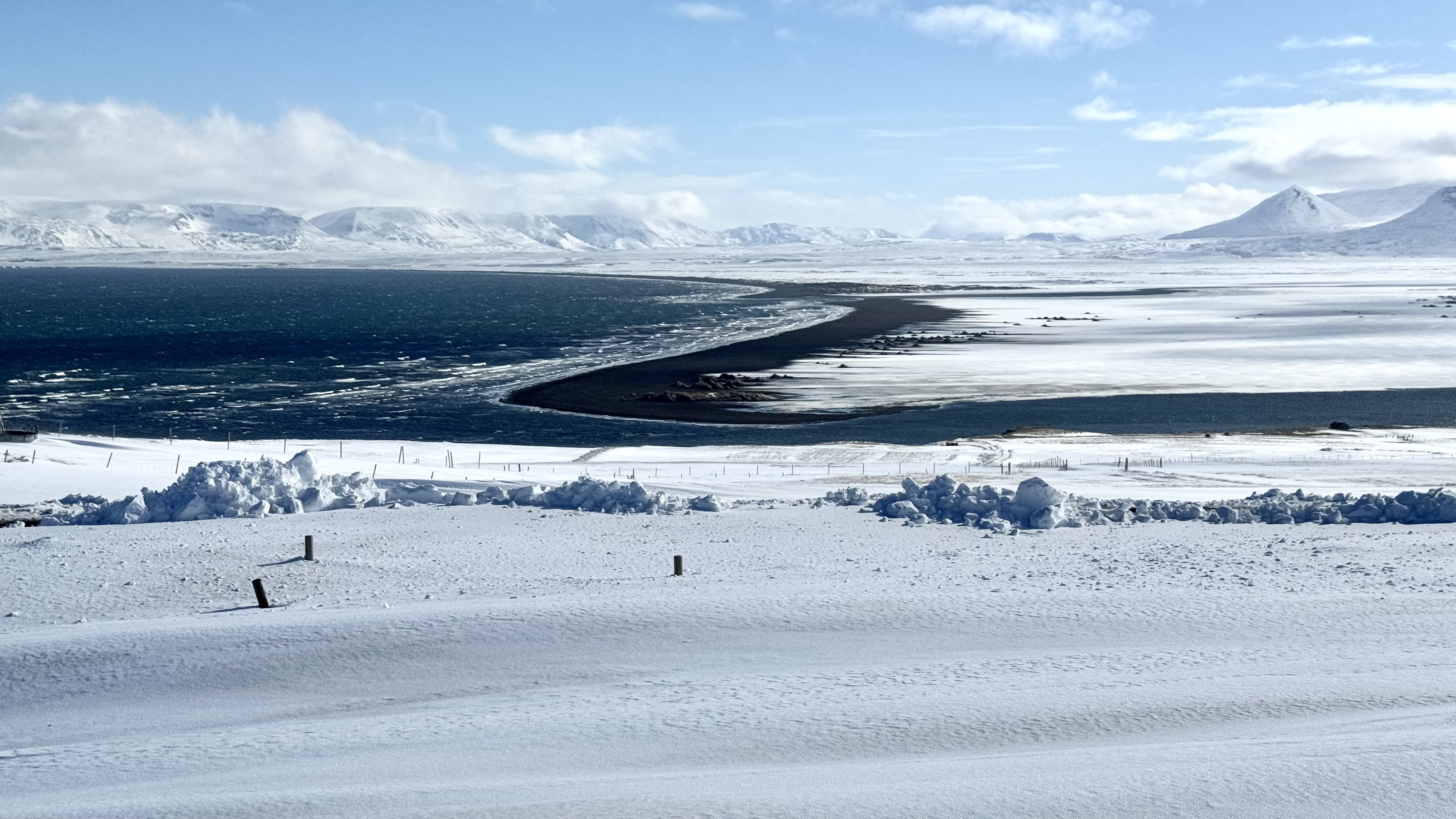 Then we walked along the gentle surf on crunchy frozen basalt sand and snow banks.
