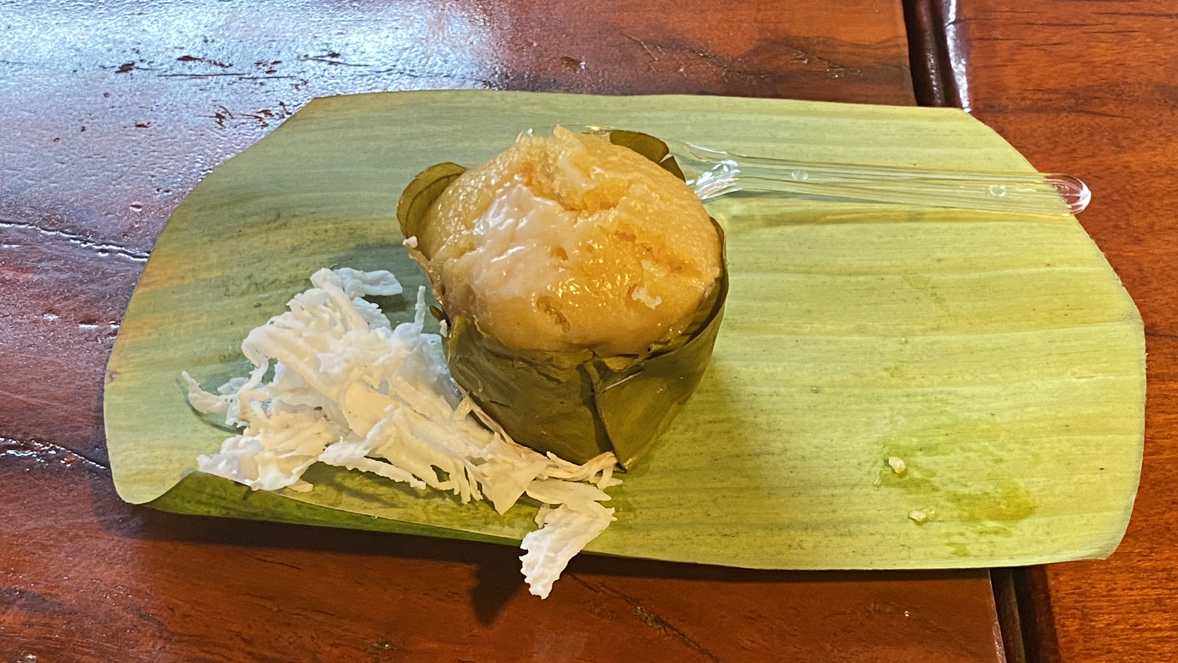 The ingredients are sticky rice, coconut cream, and palm sugar — a lot of palm sugar. We found a post online that included a quote from the Cambodian Cupcake Master Chef: “I mix the dough with palm sugar, leave it for long enough, then mix it with palm fruit and coconut milk and leave that for half an hour to an hour and then we can start steaming. With this recipe, it’s so much faster than in the past when we had to leave it for hours,” she said. ※