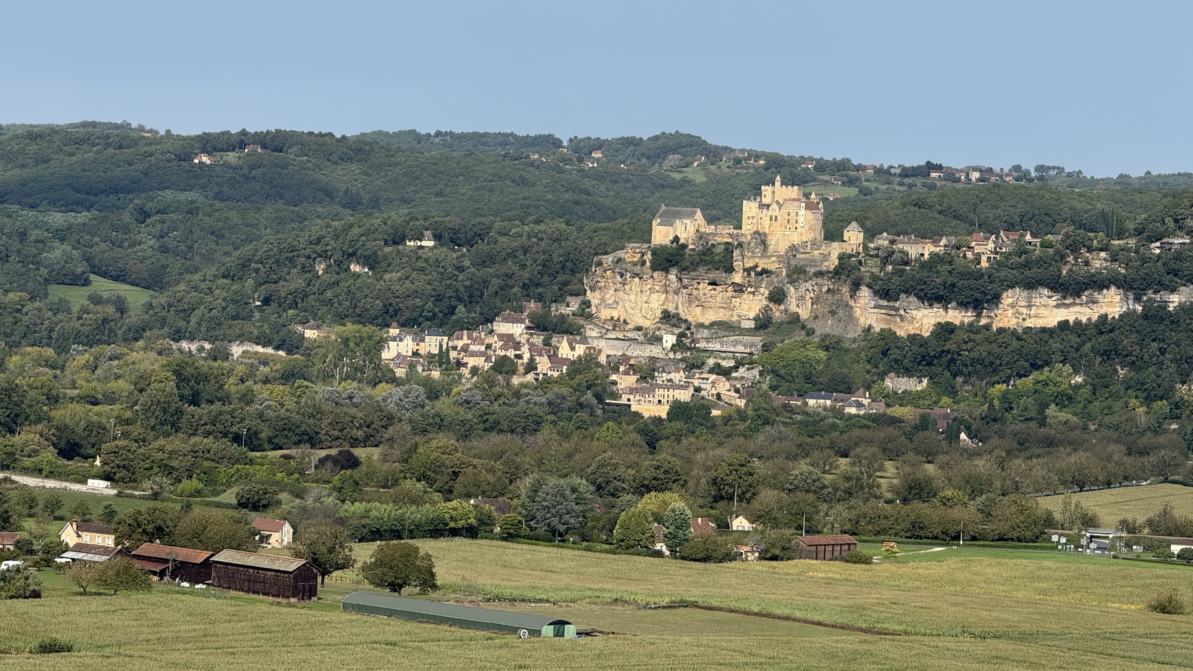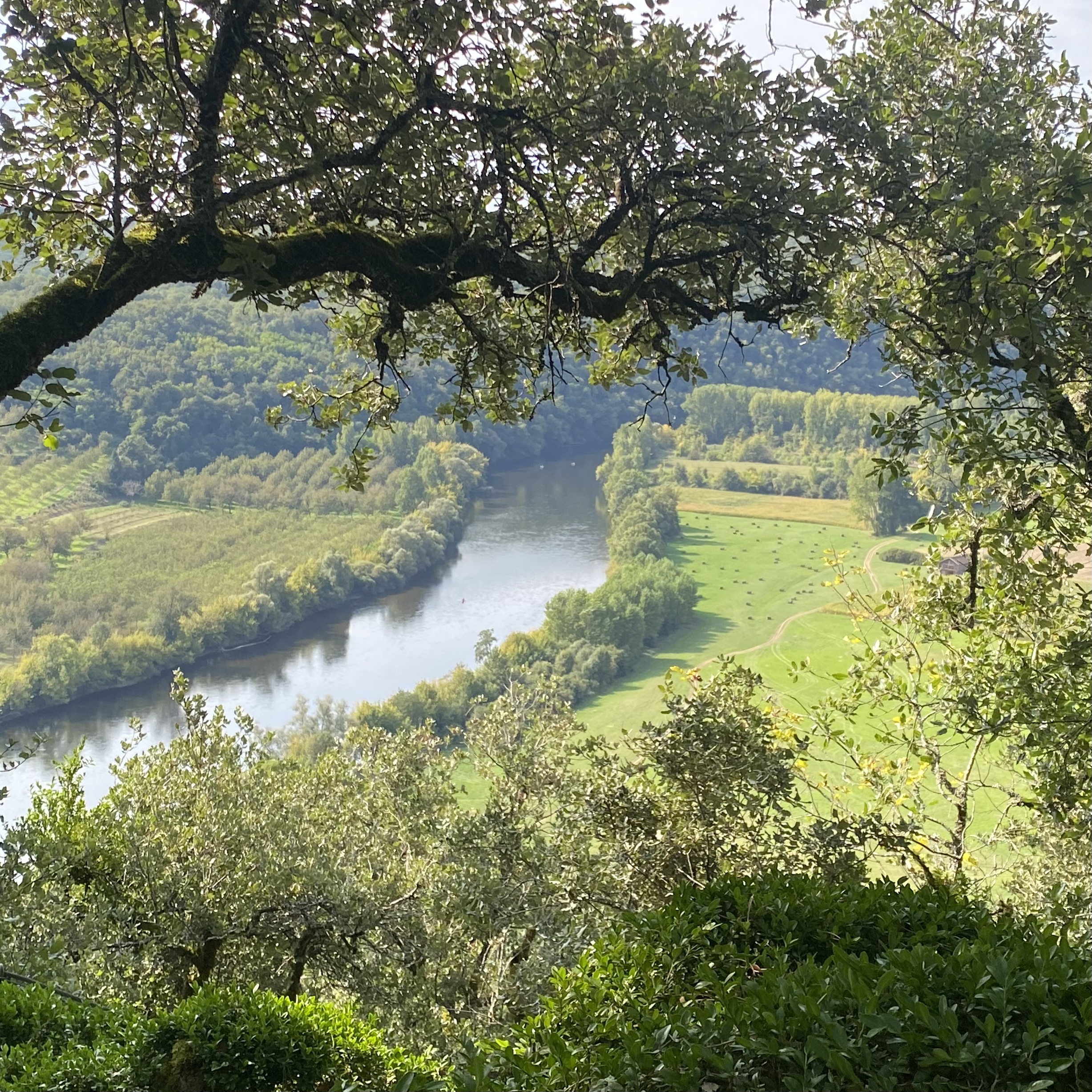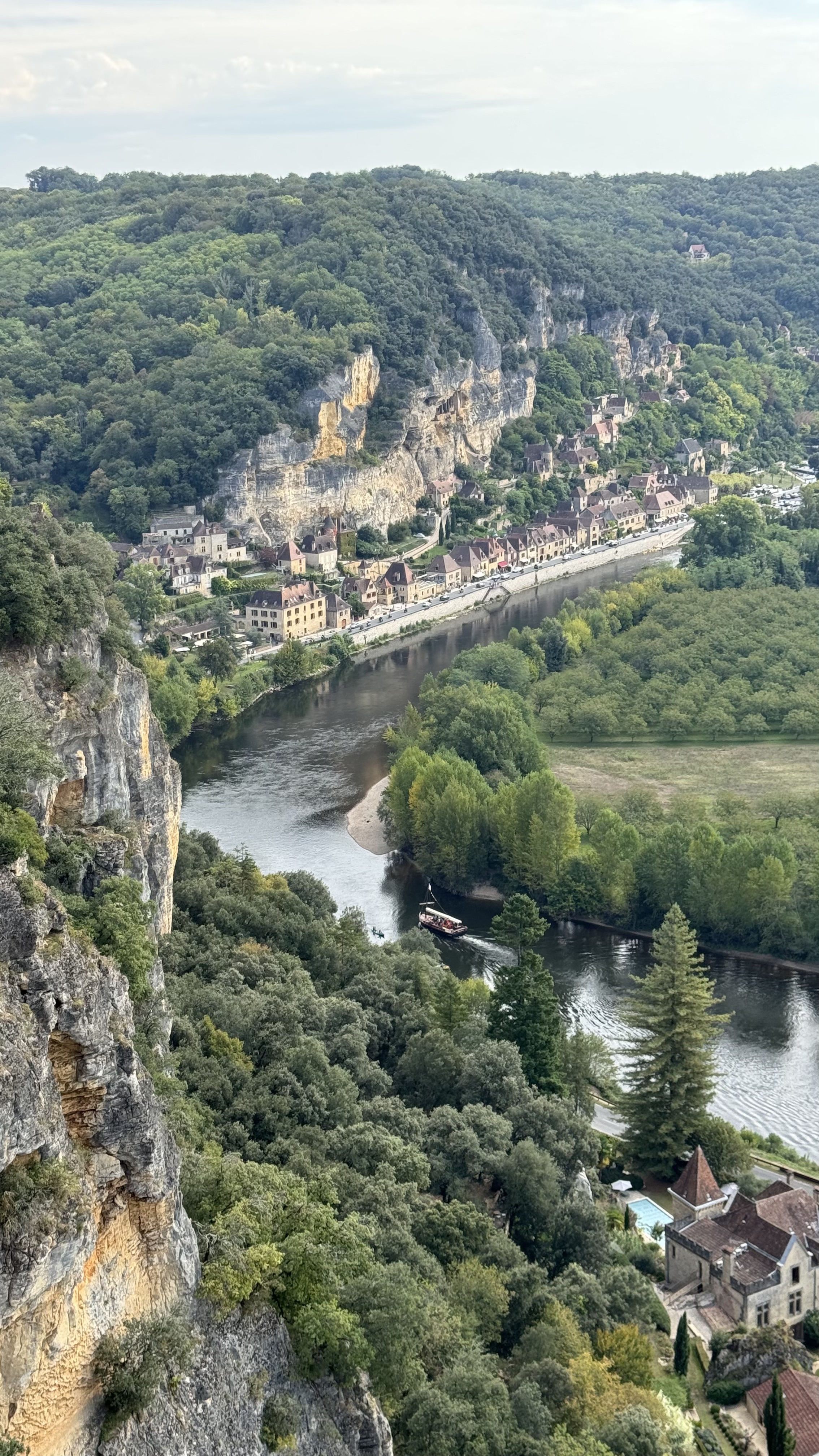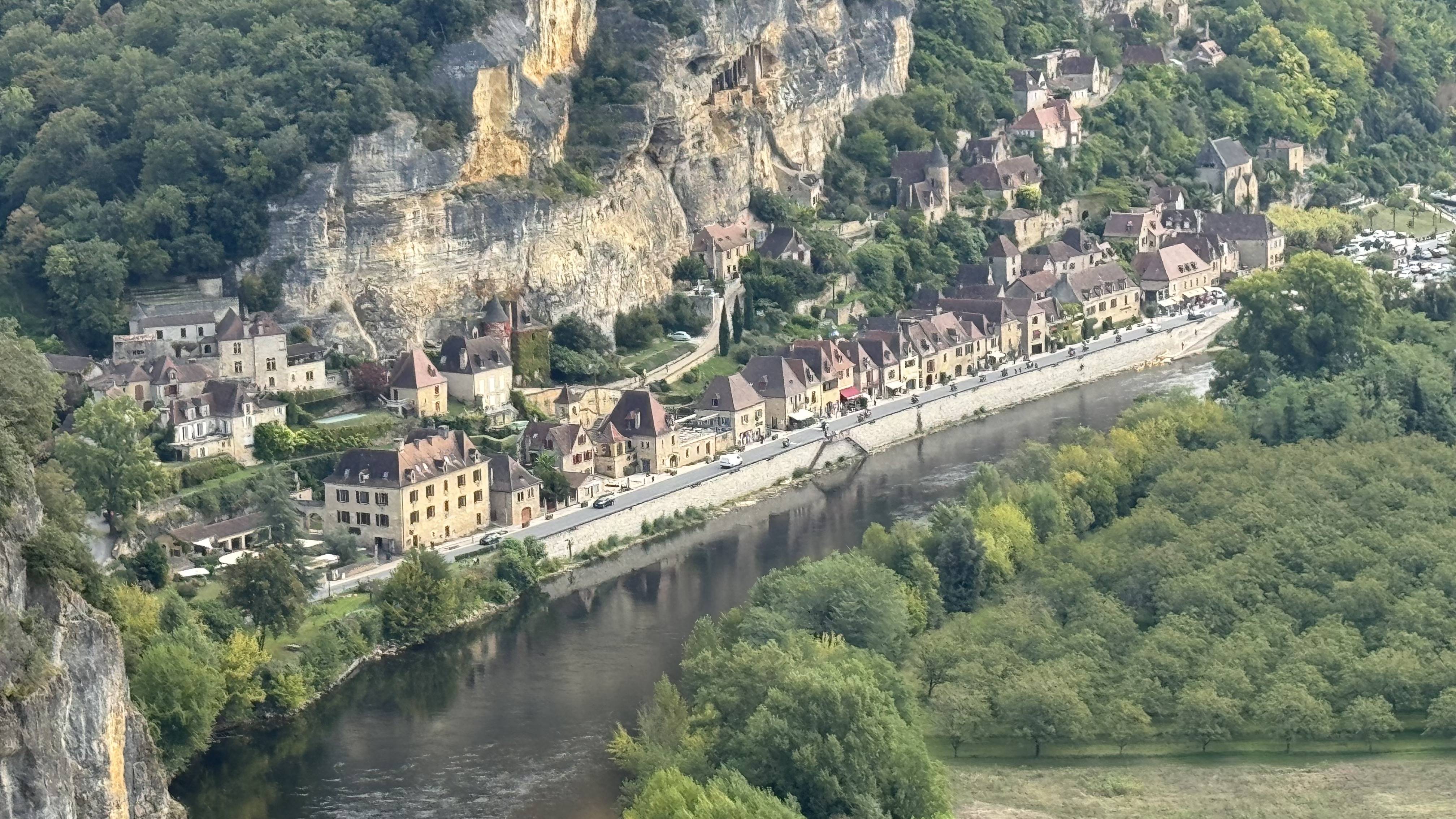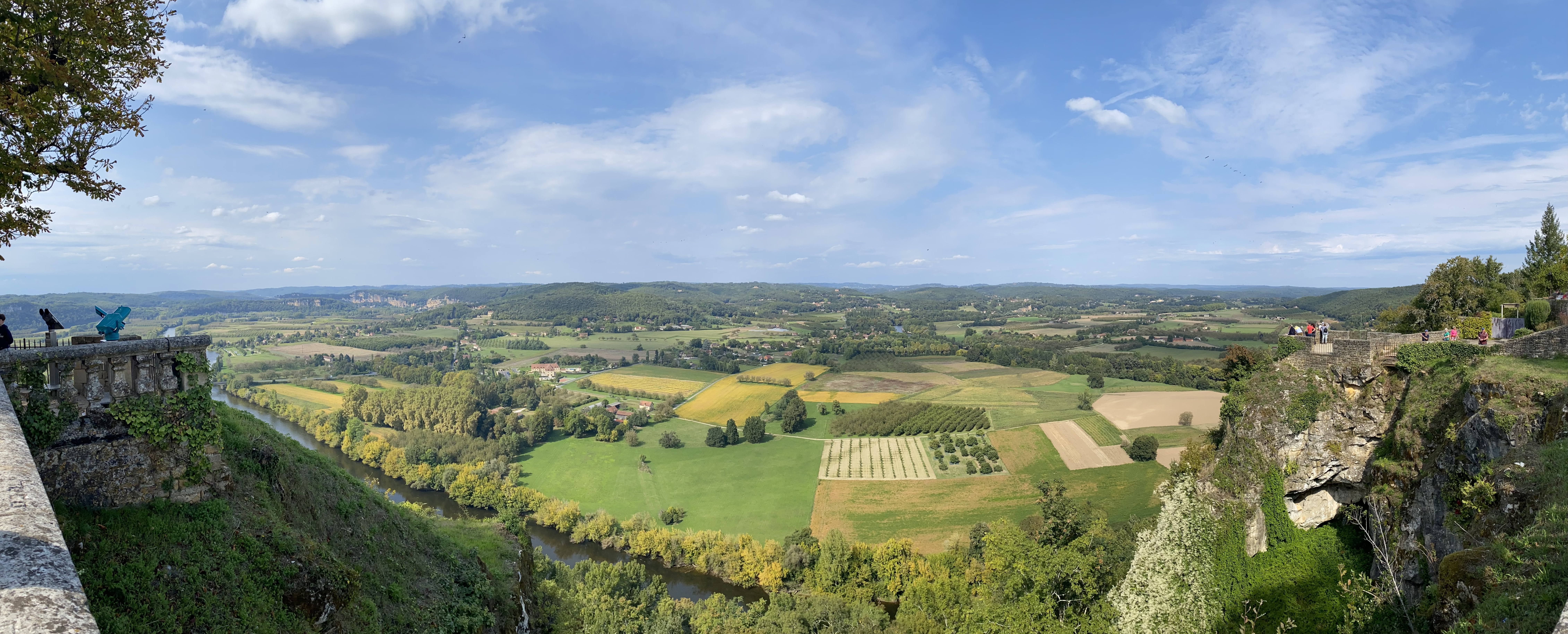 The heart of the Dordogne is its river, aptly called the Dordogne River. This is a particularly picturesque little river that winds through gently rolling countryside. Farm fields, walnut orchards, tiny villages, and imposing castles spread across the flood plain. Abrupt limestone cliffs cup some of the bends of the river. Here is a view from 150 meters (500 ft) above the river, from the village of Domme. French King Philip III had Domme built in 1281 as a bastide or fortified medieval town.