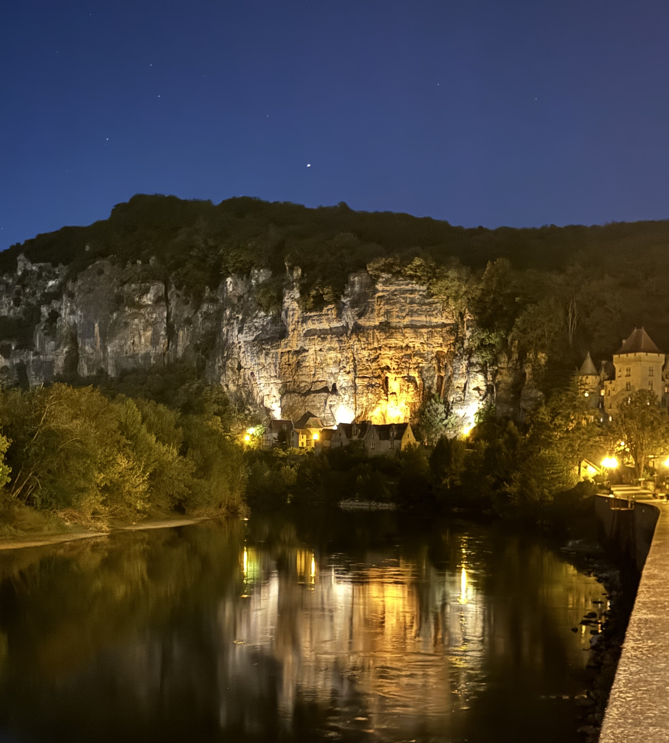 Although sitting on a site believed to have been occupied since prehistoric times, [La Roque-Gageac’s] documented existence traces back to the mid-ninth century, when Vikings were sailing their longboats up the river with raiding on their mind. For the first few centuries of its existence, La Roque-Gageac was a troglodyte fortress, set in caves some 40 meters (130 feet) above the river, the remains of which can still be seen above the village today. It was not until the end of the Hundred Years’ War that the “Laroquois,” as its residents are called, felt safe enough to move down to the lovely Renaissance homes that we see today, lining the riverbank and the narrow footpaths climbing to the base of the cliff. (source)
