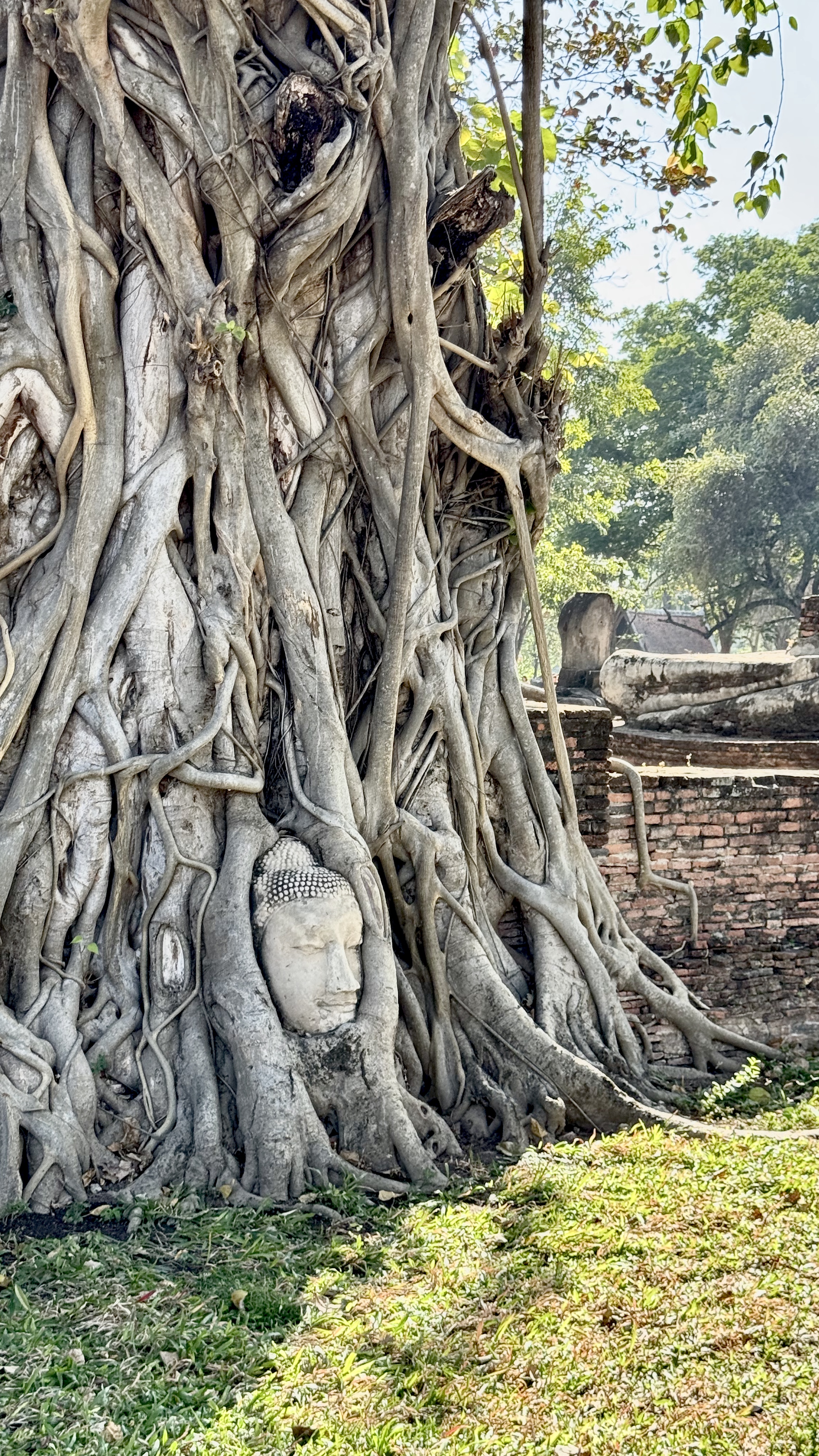 A year before our visit to Thailand, we had visited Angkor Wat in Cambodia. Those temples have fallen into disrepair over the centuries, but since they were constructed of stone, they have retained more of their original forms. Reconstruction has been successful since the stone parts exist still, even if they’ve tumbled to the ground.
