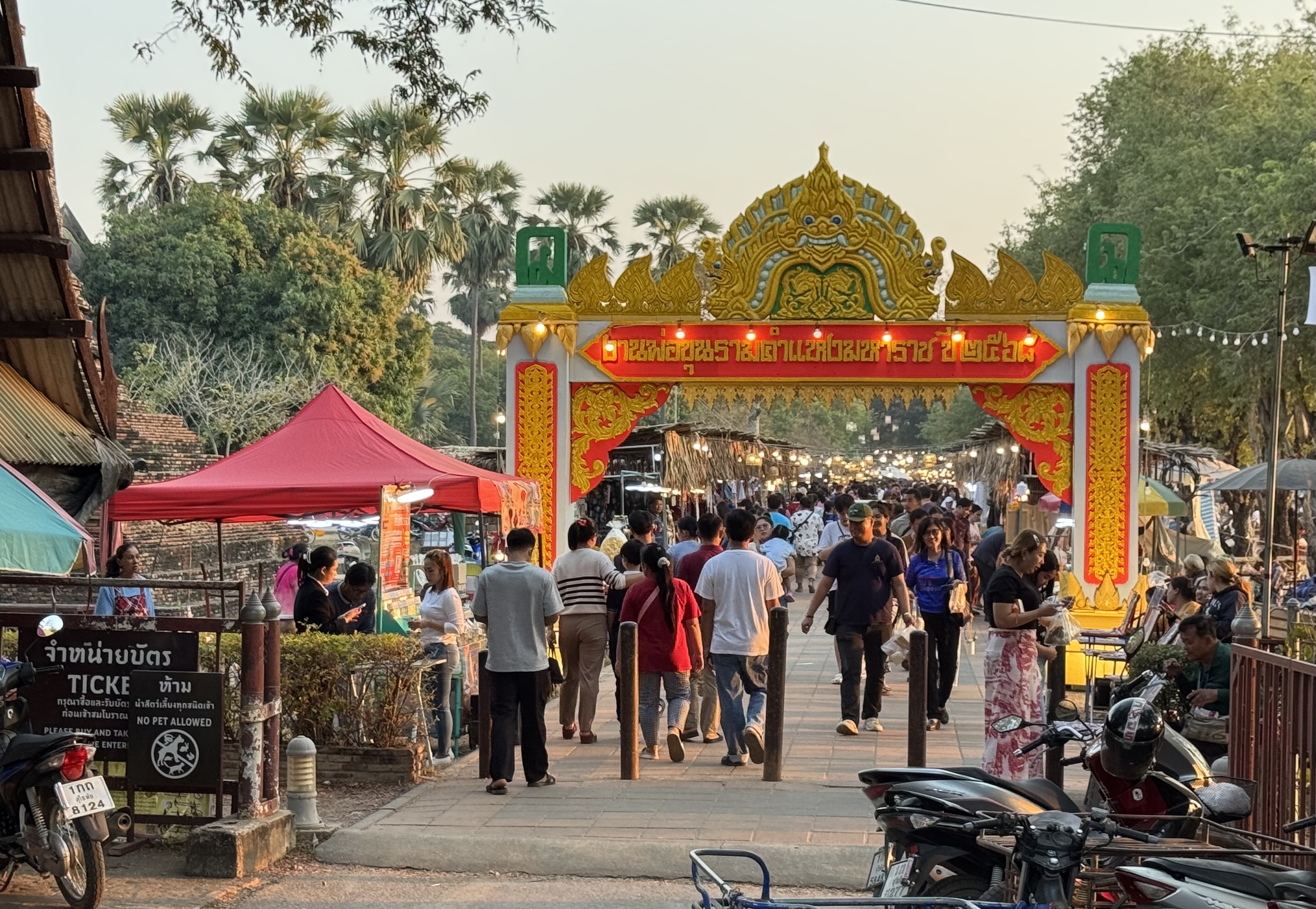 Speaking of elephants: We were fortunate that on the evening of our visit to Sukhothai, the town was celebrating a festival. Celebrations means night markets, full of stands selling food, temple items, clothing, and just about everything else.