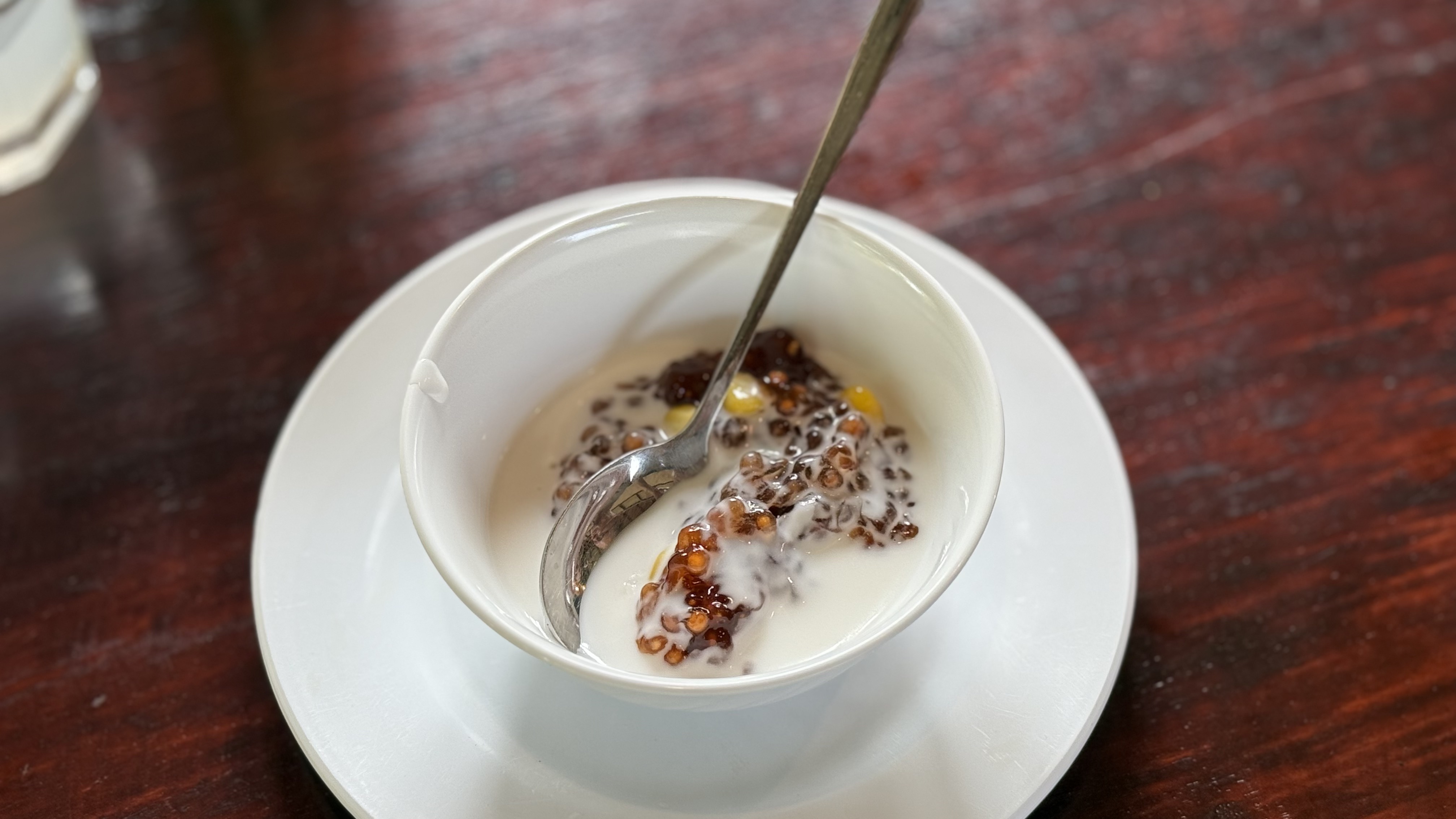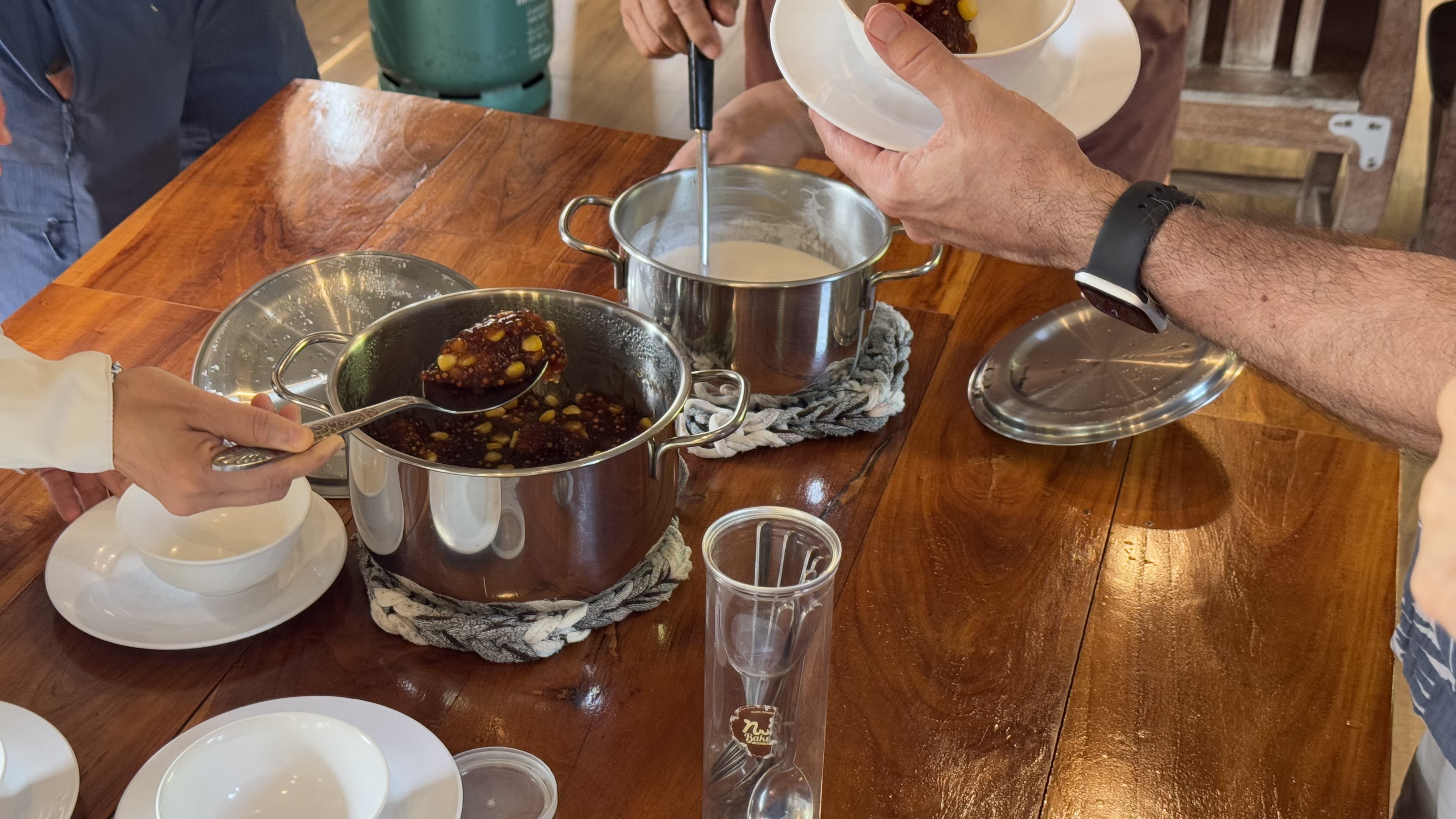 Dessert was something new for us. The compote-looking part is a local fruit whose name we forgot to make a note of. Cooked up, it has a gelatinous texture. The yellow bits are corn! You pour nice thick coconut cream over it. Fascinating mixture of textures, sweetness, saltiness, and unexpected corn.