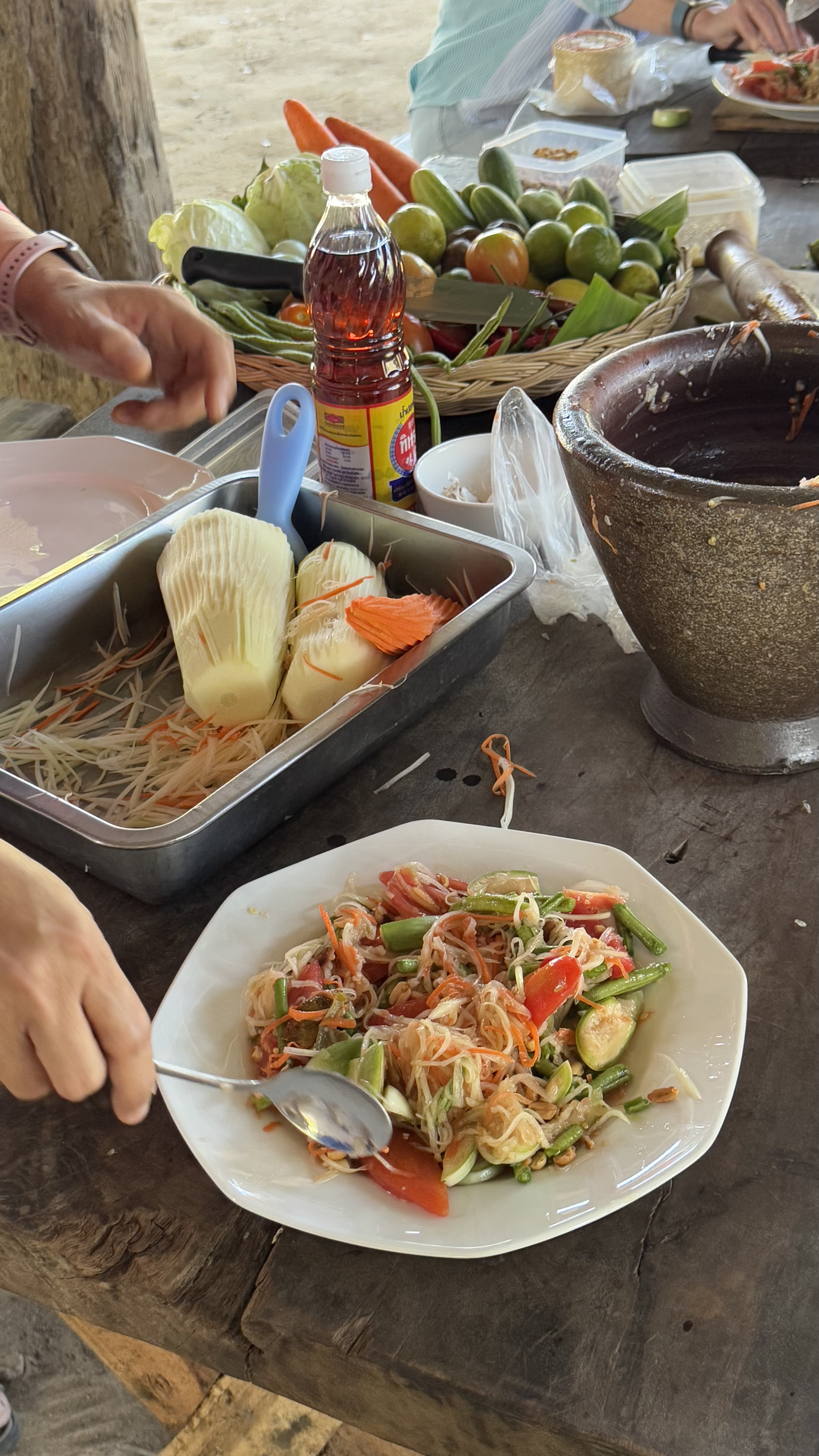 We shaved green papaya, and cut up tomatoes, small crunchy local eggplant, long beans (or snake beans!), cabbage, carrots, cucumbers and limes for a very fresh and very spicy green papaya salad.