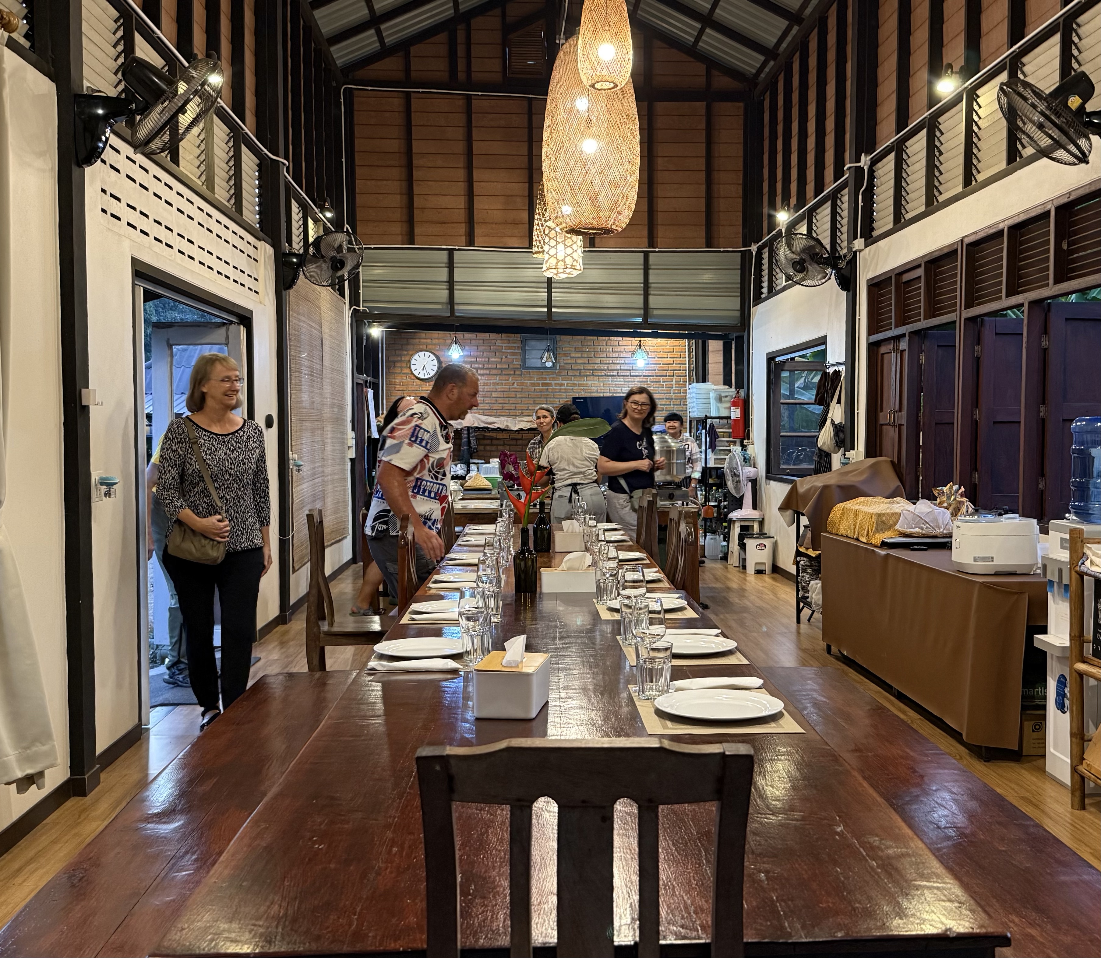 We arrived at a collection of rustic wood tables and benches and roof structure, and some cool water with pandan leaf for spice. We found pandan leaf throughout Thai dishes; it’s used more for the green color it gives the food than its subtle flavor.