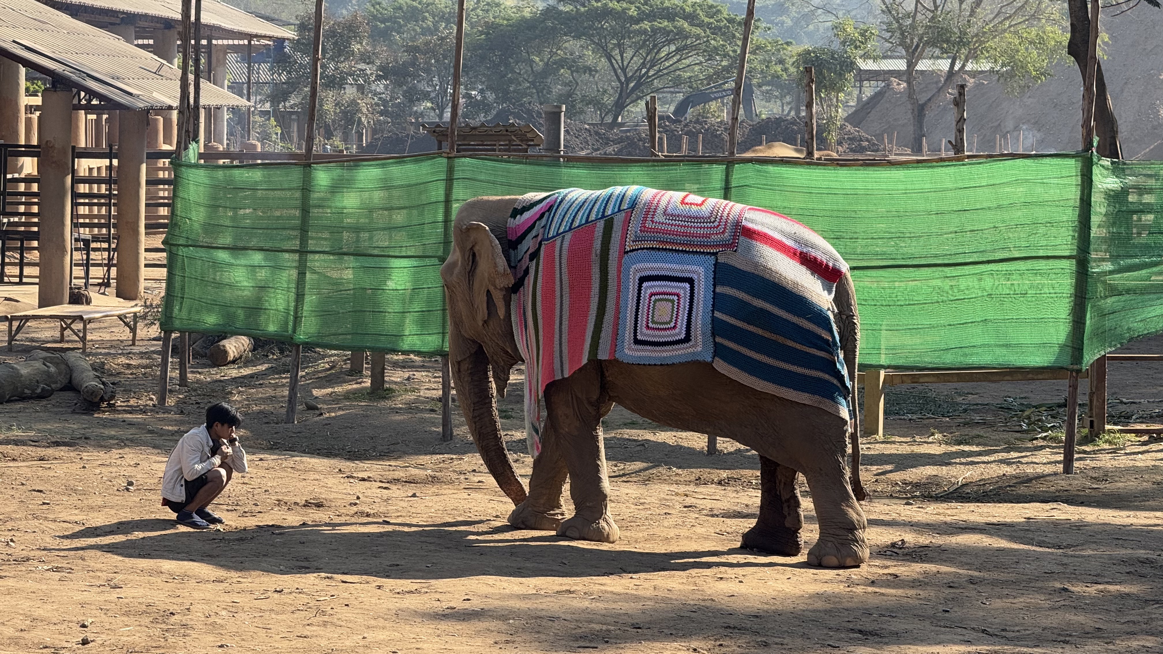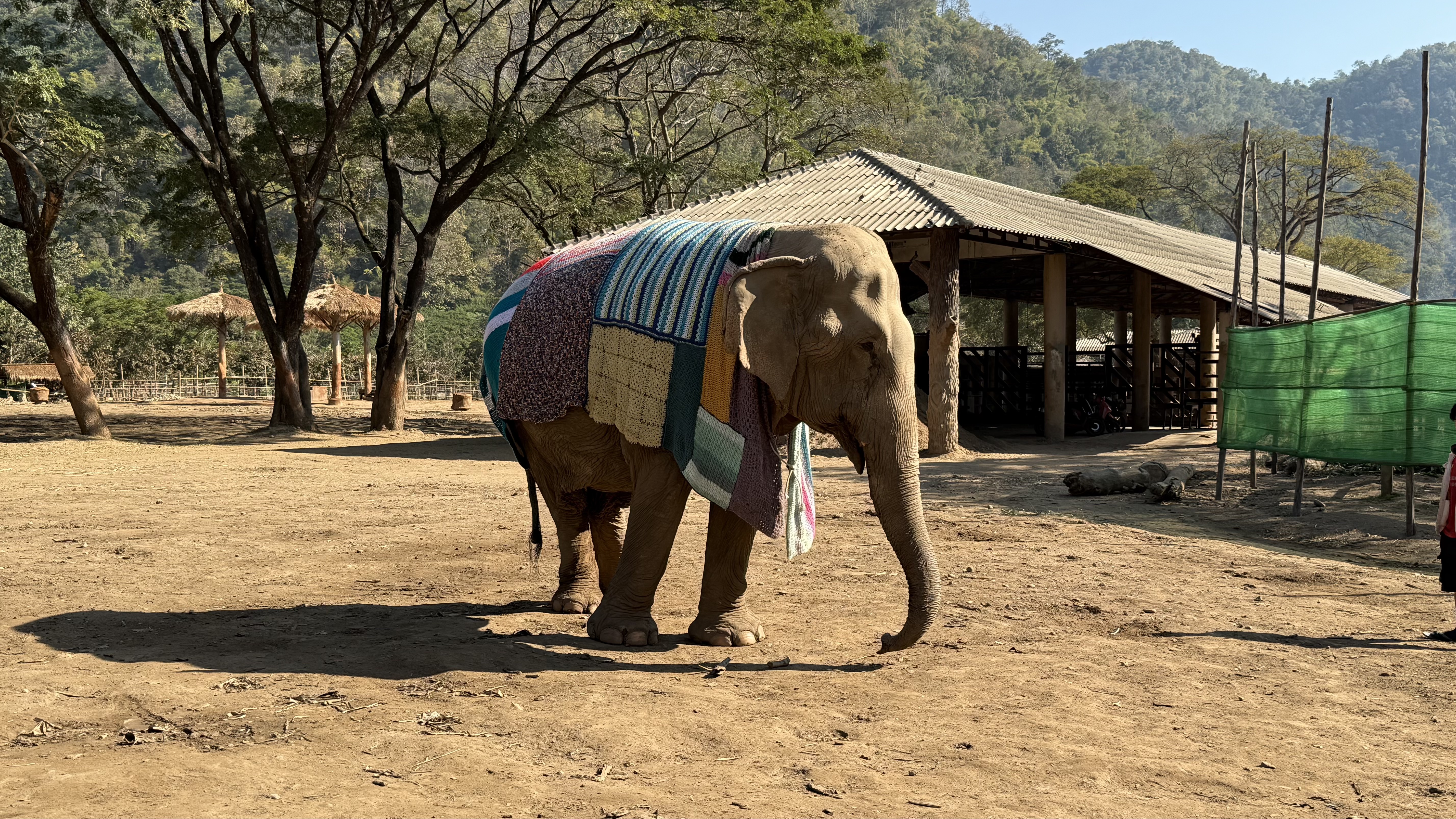 We visited the Park on a cool January morning. It was maybe 15 deg C / 60 deg F. A patchwork blanket covered this old lady. She needed a little protection from the cool. While we were walking around and the day was warming up, she started to tug with her trunk on the blanket from both sides. Sign that she wanted it off so she could enjoy the warm day.