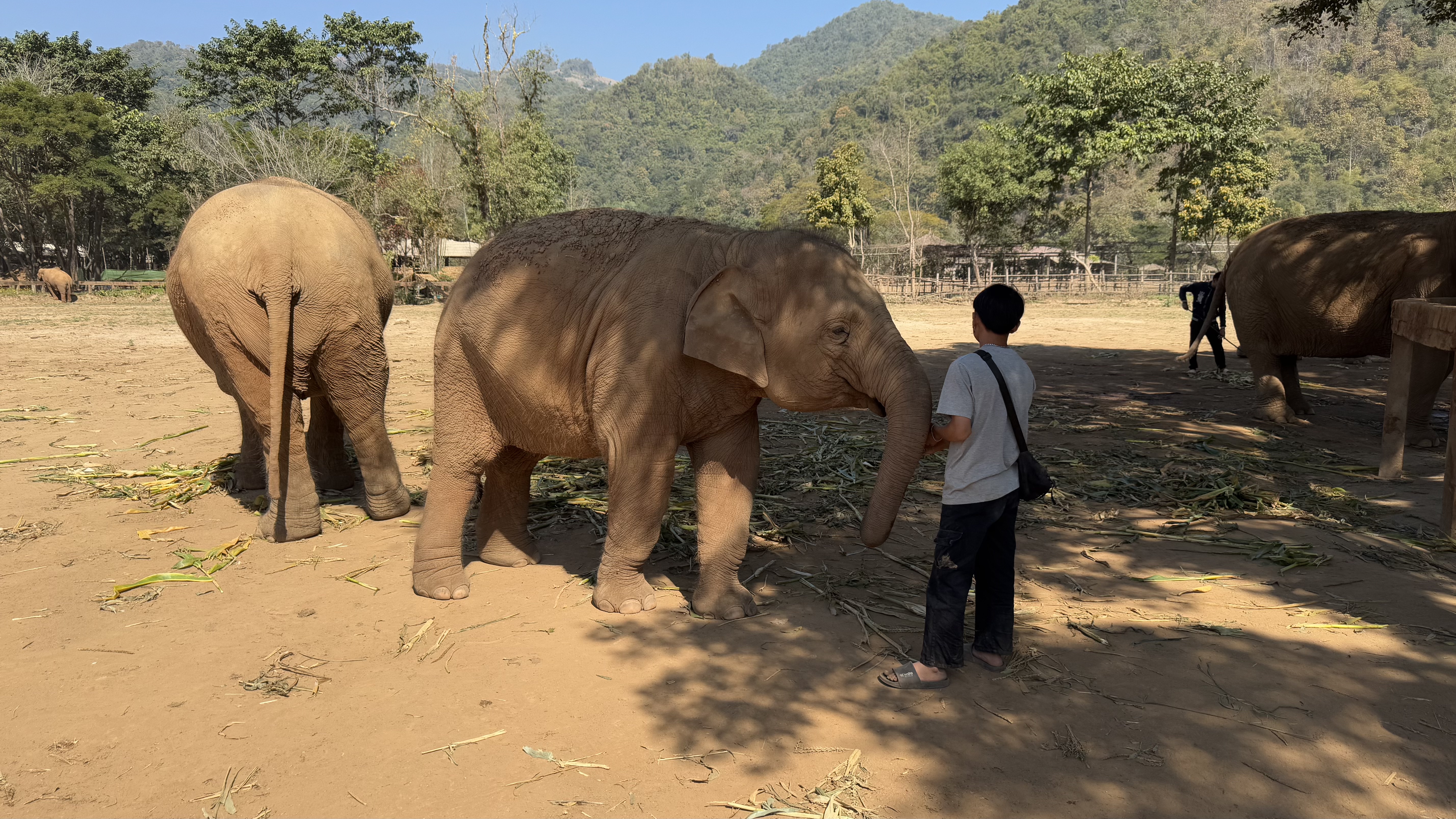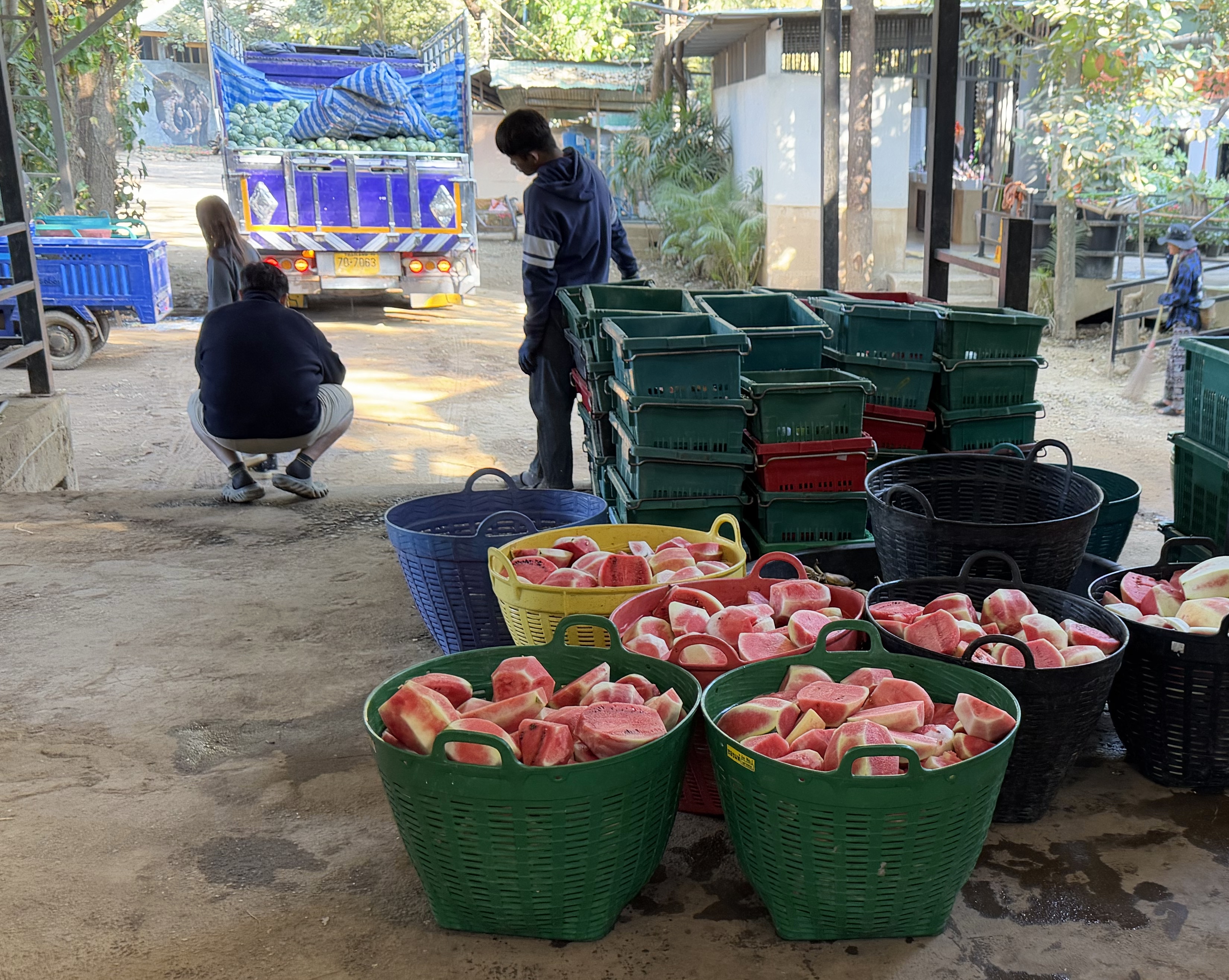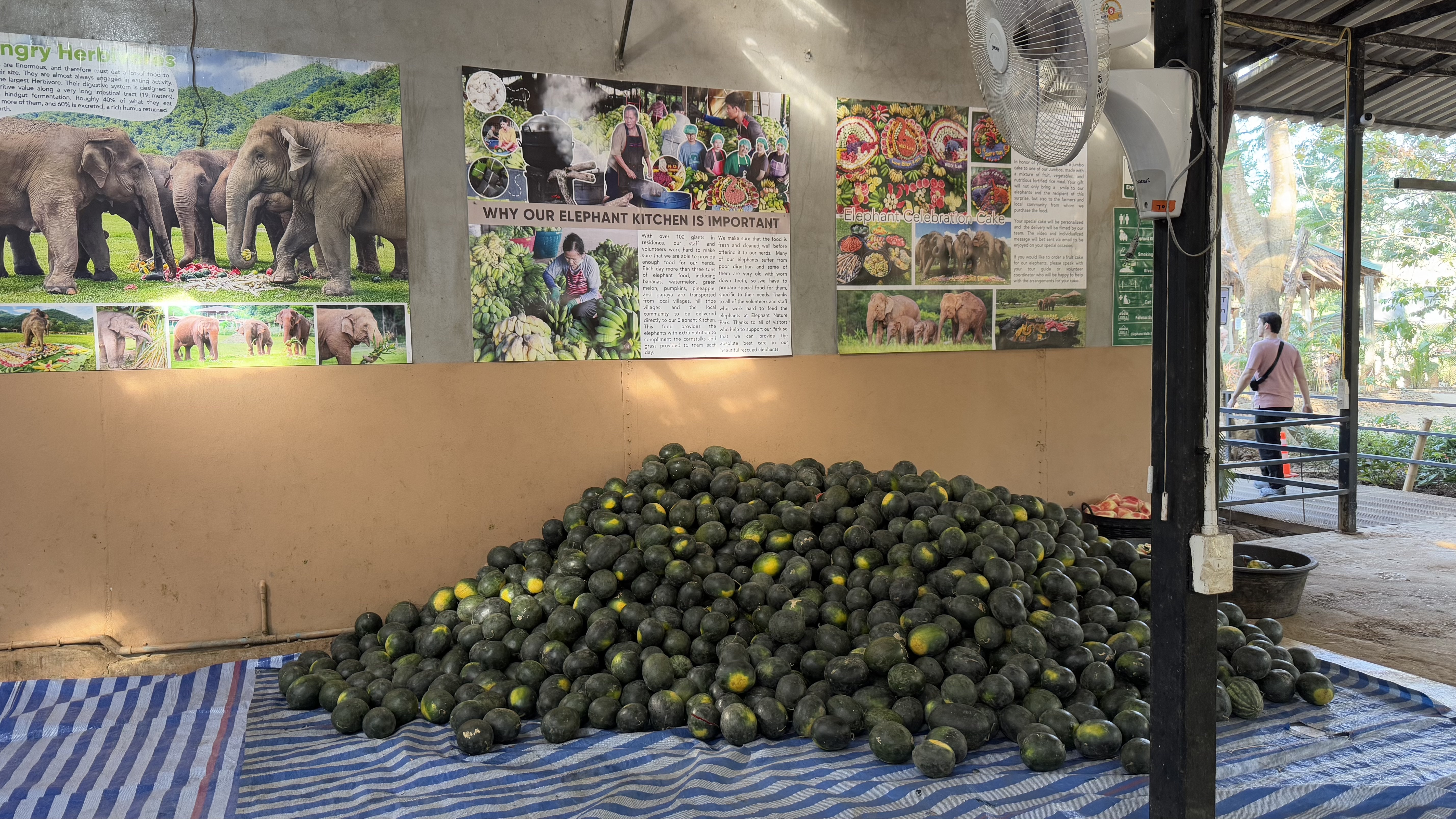 Before we met any elephants, we could see a bit of the scale of the operation, and the amount of work the volunteers need to do. Such as this pile of watermelons being readied for elephant lunch.