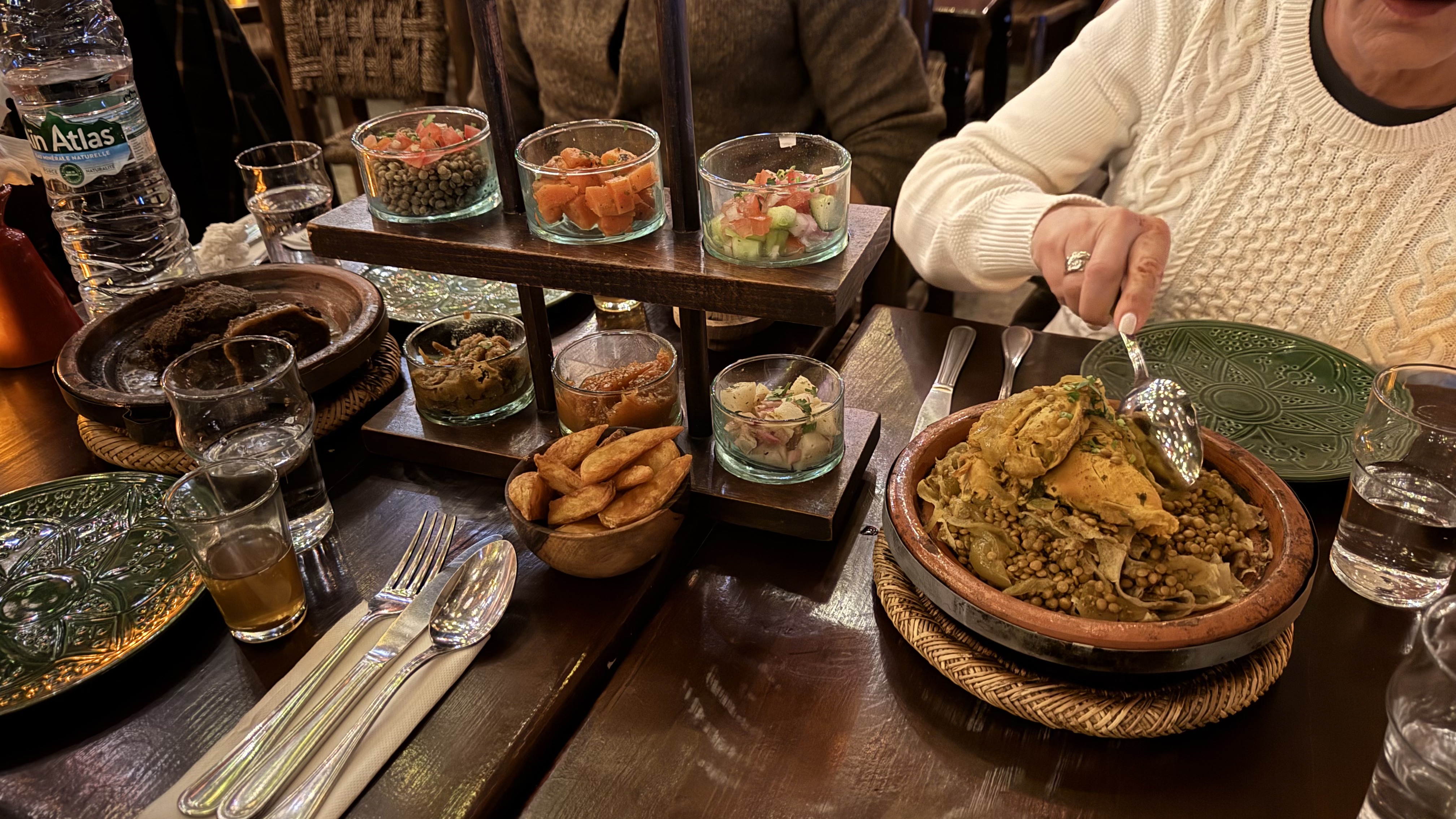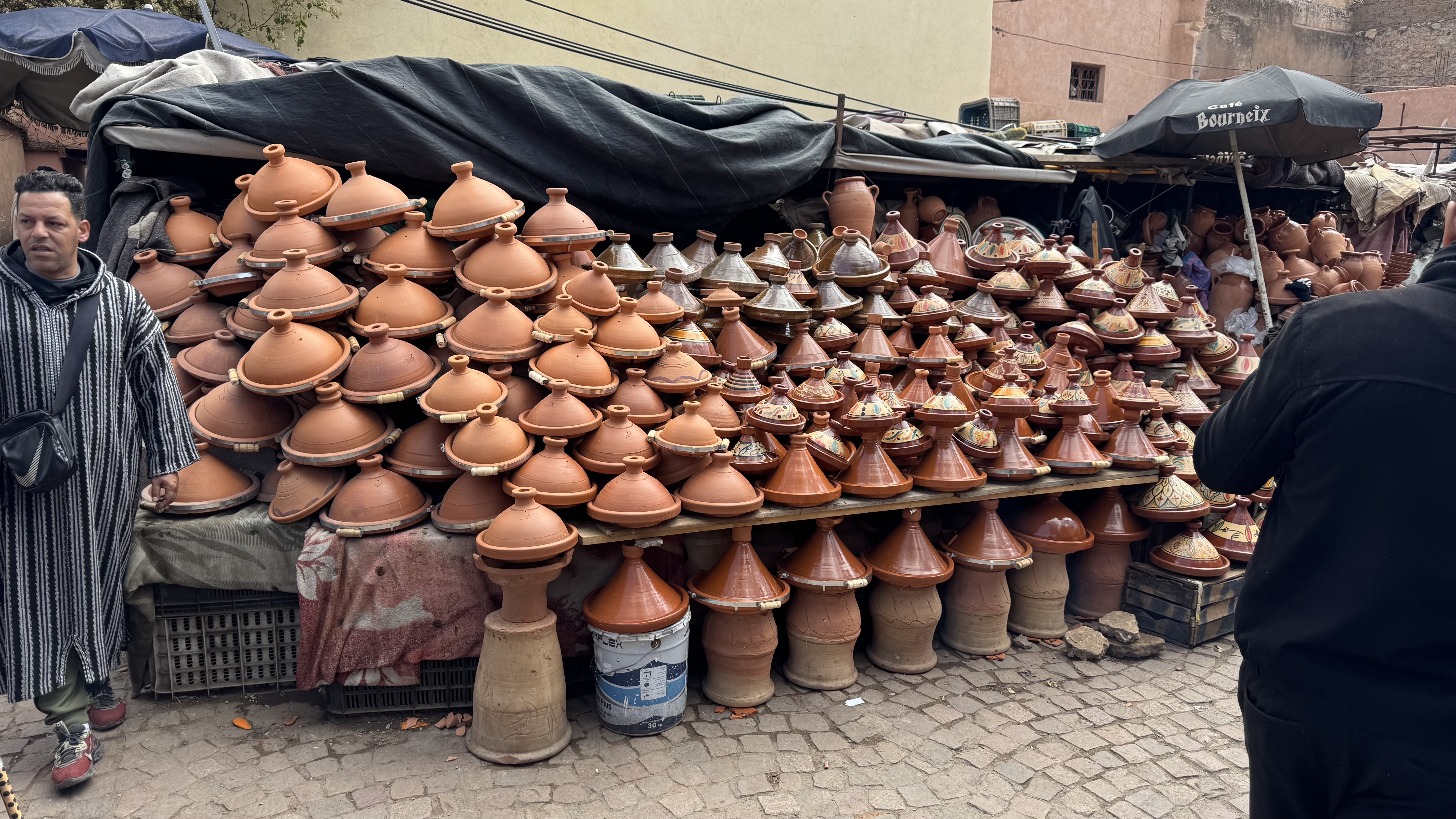 Another stop was at the top of a tight set of rough stone stairs that descended down from street level. This place is the furnace that heats water for an adjacent hammam, or communal bath. On the ashes of the wood fire of the furnace, ceramic jugs contain meat, vegetables and spices. These are called tanjia (which is different from the conical dishes called tajine). Families prepare these jugs of stews and deposit them in the morning. The food cooks slowly all day long, cared for by the people responsible for the hammam furnace. The families return in the evening after a long day at work to collect their fully cooked and healthy dinner.