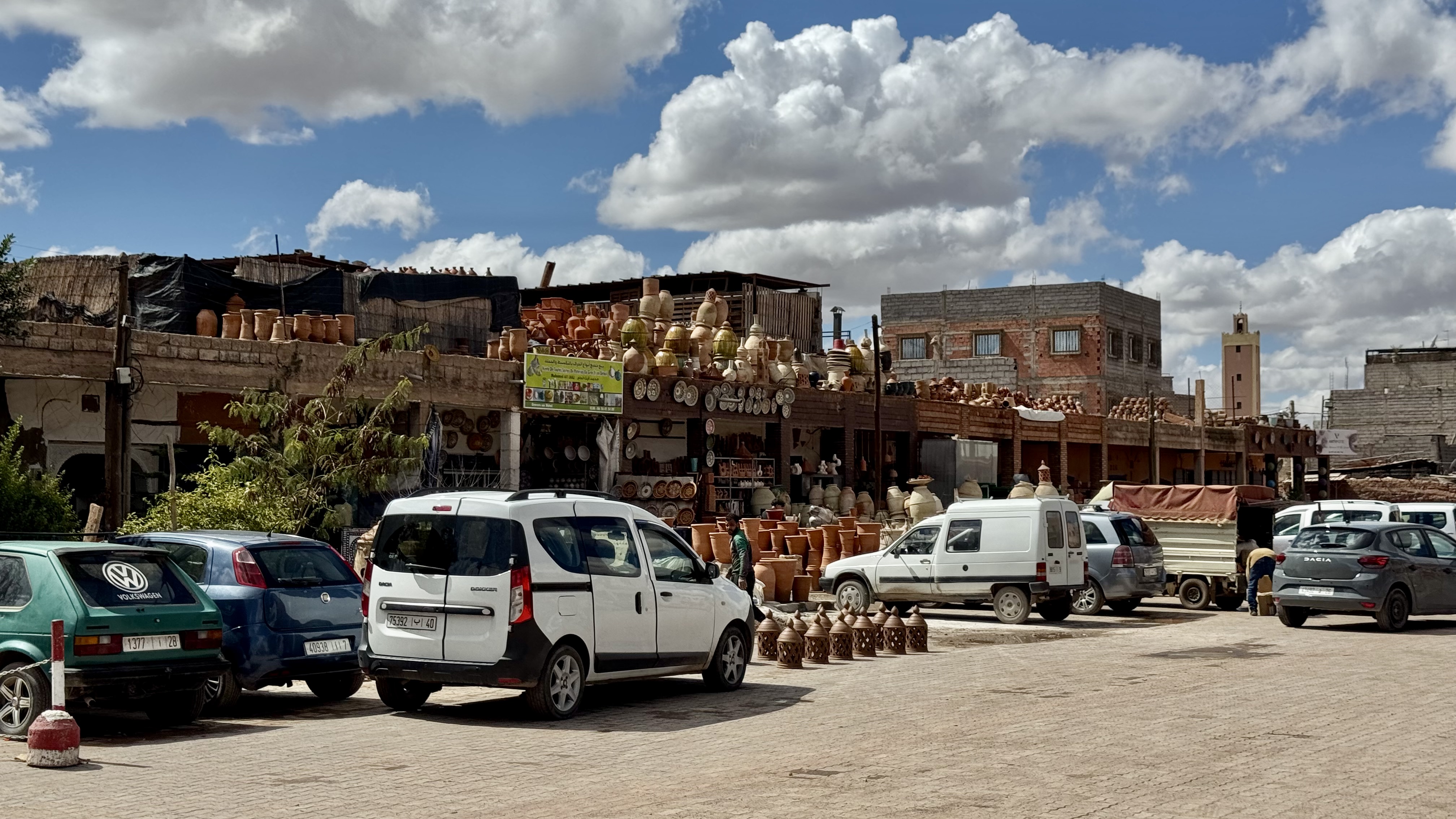 There are many stalls that showcase glazed and decorated pottery. On the way to the Jardin Majorelle, Ben arranged a stop at a pottery district on the outskirts of the city. In addition to his tour guide business, he buys and renovates riads(courtyard houses); he knows very well the building-material suppliers around town and wanted to show us a couple of his sources.