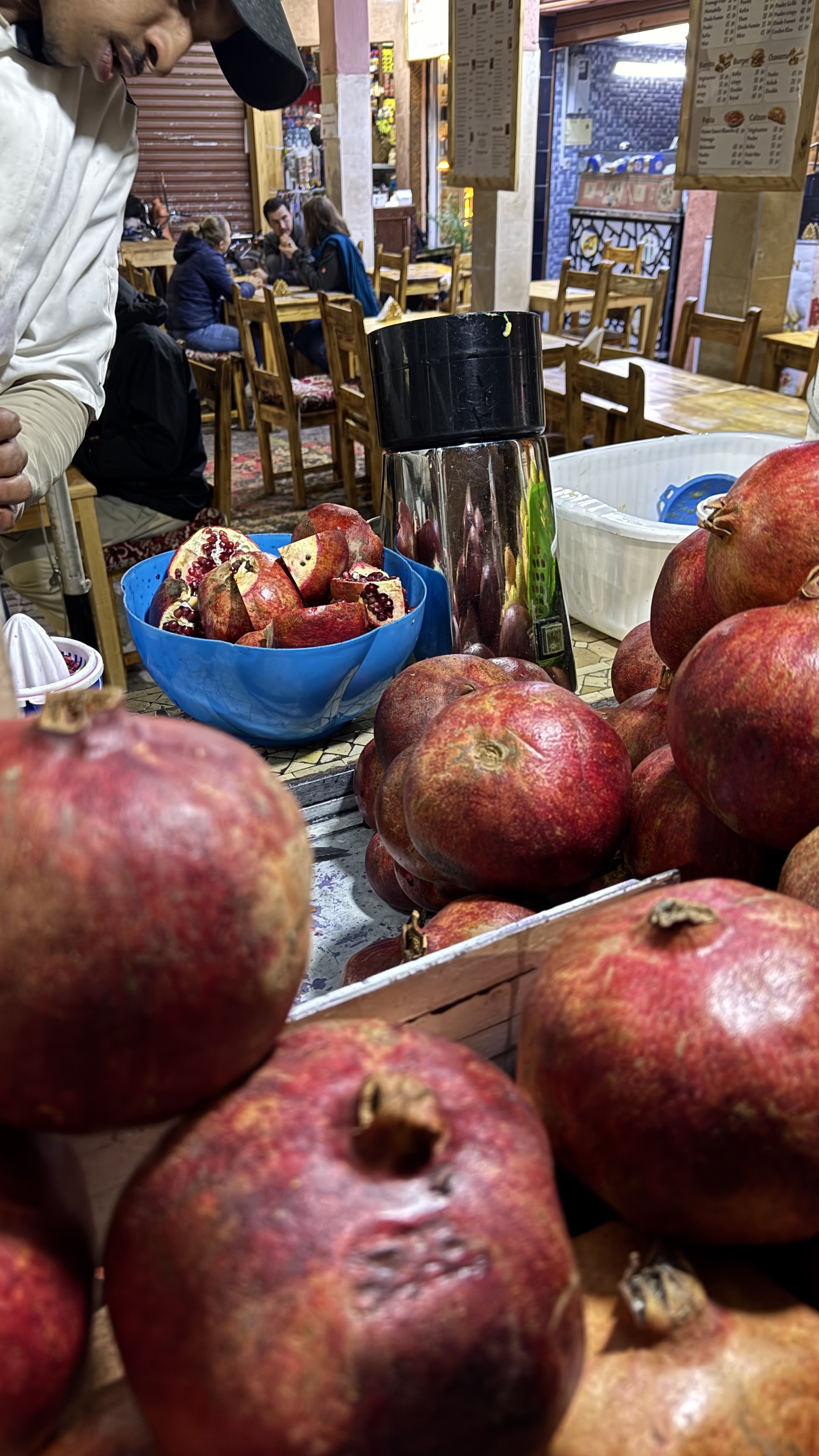 On two evenings, Ben led us around the medina to sample Marrakechi street food as well as signature dishes. We visited during the season of Ramadan. Many people in Marrakech fast during the day. After sunset, they break the fast in stages. First step are light things like juices and fruit. Then a couple hours later, the family gathers for a dinner. During our two evening food strolls around the medina, we started light and then finished in restaurants. We’ve combined the two tours together here.